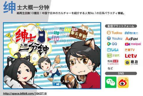 office339が制作するインターネット動画番組『绅士大概一分钟』(紳士の大体1分間)は、日本人KOLが現代日本の情報を中国人視聴者向けにコミカルに伝えるバラエティです。総再生回数は実に10億回を超える人気番組となっています。
