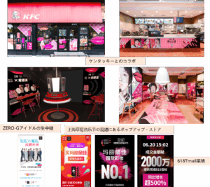 華やかなカラーで若者から人気を集めているコスメブランド瑪麗黛佳は618のイベントにあたって、ケンタッキーフライドチキンとコラボ、KFC店内を瑪麗黛佳のイメージにデザインしました。また人気の音楽フェス・上海超級草莓音楽節(Strawberry Music Festival)の会場に「瑪麗黛佳 × KFC」のポップアップ・ストアを開店したことで、ポップアップ・ストア、チキン、アイスクリーム、口紅といった新鮮な組み合わせは多くの若者達人や一般ユーザーから注目を集めました。