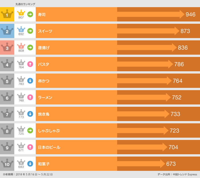 トレンドExpressが毎週行っている中国ソーシャルメディアにおける日本関連書き込み総件数ランキング。その中から「行った」、「食べた」、「〇〇したい」などインバウンドに関連したランキングをピックアップし、注目のキーワードを分析します。今回は2018年5月16日~5月22日の「食べた」ランキングから、日本で体験したい新たなコト消費に対する人気ポイントを分析します。