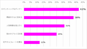 高級ホテルやディナーといった物的な豪華なロマンを楽しむと同時に、「草原で星空を眺める」、「美しい海岸を楽しむ」、「青い海を見つめる」といった、心をいやす自然に包まれるロマンを求めていること、SNS映えを意識したフォトジェニックという点を重視していることが読み取れます。