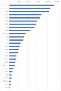 ダントツで多いのが「日本」というキーワード。同製品が日本のウイスキーブランドであること、日本製であること、また日本からの直輸入であることに対して、消費者が関心を抱いていることがわかります。