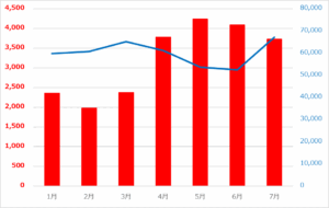 クチコミ件数を見てみると、5月以降から徐々に減少にうつりますが、それでも7月時点では1月に比べて1.6倍程度の件数が確認でき、その人気は衰えていないと予想できます。