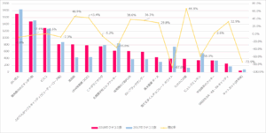 これを見ると、「白い恋人」や「龍角散ののどすっきり飴」は昨年と同じく1位、2位をキープしていますが、クチコミ件数としては昨年の国慶節を下回っています。