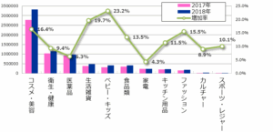 しかしながら、クチコミ件数の増加率をみると、クチコミ件数が2番目、3番目に多かった「衛生・健康」及び「医薬品」の伸び率は10%未満と停滞しています。一方、2017年から1ランク上げた「ベビー・キッズ」が23.2%増と唯一20%台に乗るなど、伸びが顕著です。これに「生活雑貨」、「コスメ・美容」、「ファッション」の順でクチコミ件数が伸びています。
